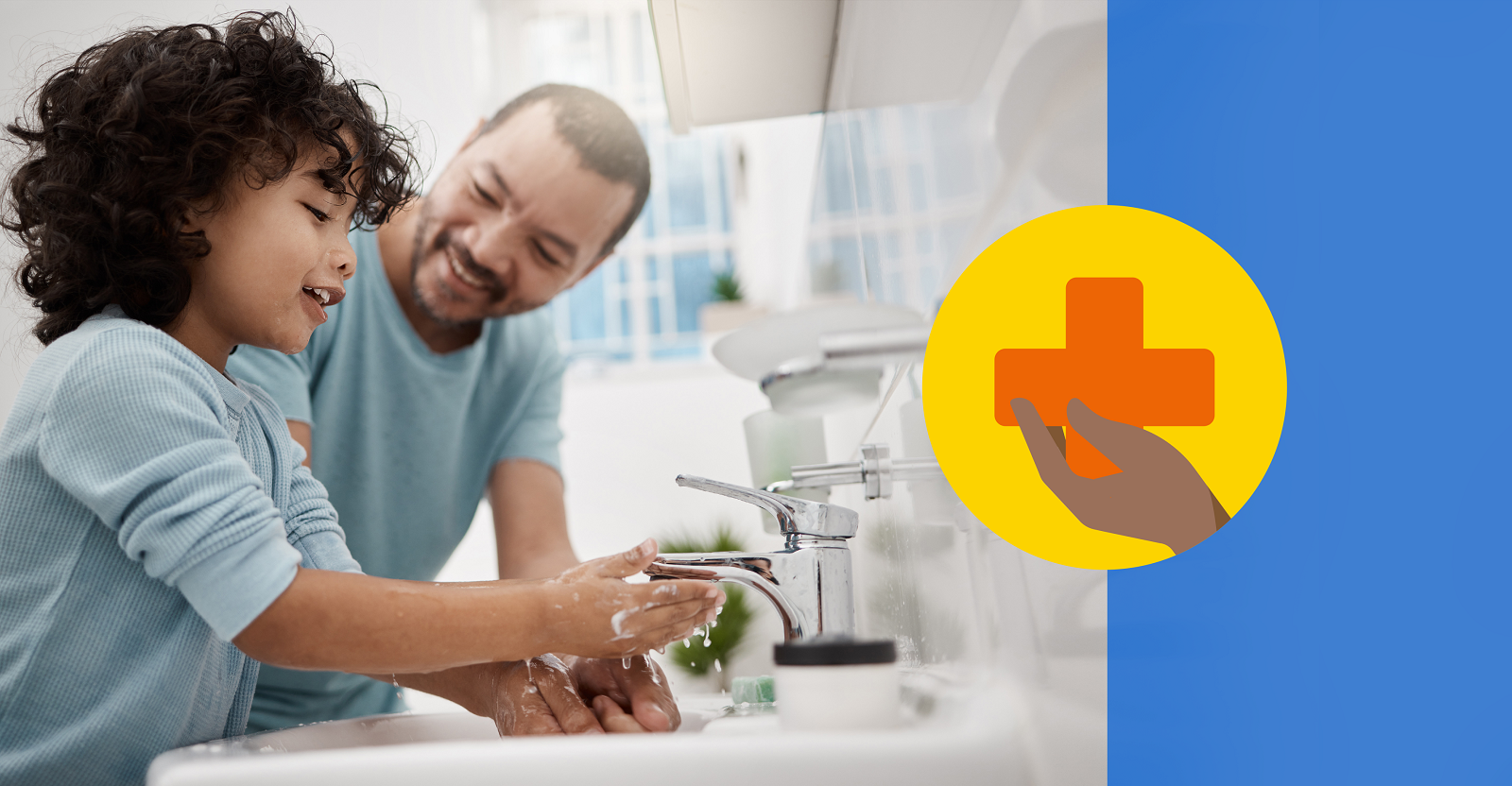 Father and son smile at each other as son washes his hands next to a graphic of a hand holding the Red Cross logo