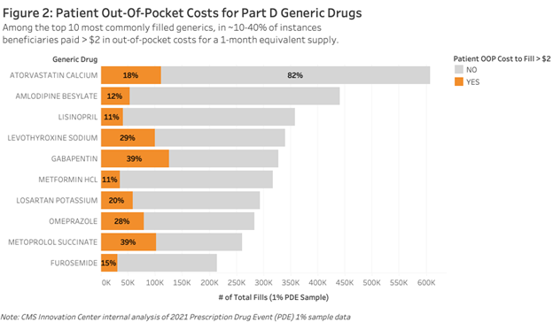 The Innovation Center also reviewed historical prescription drug events (PDEs) to understand beneficiaries’ out-of-pocket costs for generics. Of the 10 most commonly filled generics in 2021, a beneficiary paid more than $2 in out-of-pocket costs for a one-month supply roughly 10-40% of the time (Figure 2).