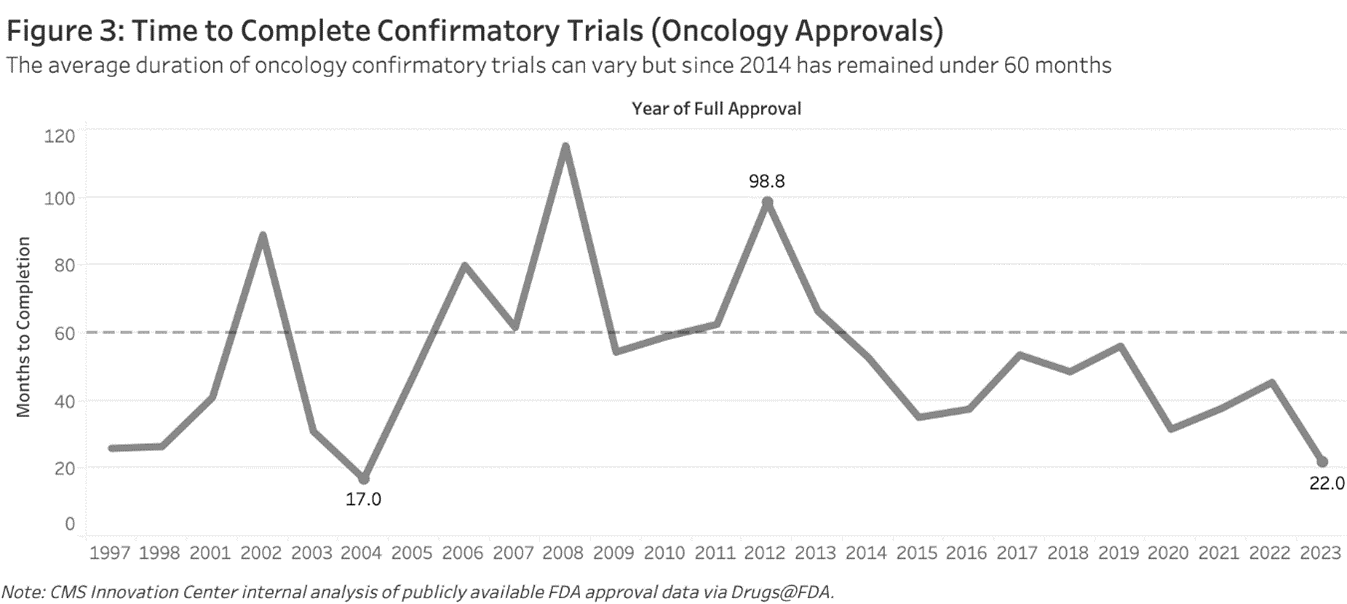 To inform model design, the Innovation Center, in partnership with the FDA, reviewed data on the current and historical trends of Part B drugs approved through the AAP. The analyses showed that more than 90% of accelerated approvals for Part B drugs over the past five years were for oncology indications. The time to complete confirmatory trials for Part B drugs for oncology indications has remained below five years (60 months) since 2014 (Figure 3). The active approach taken by the FDA’s Oncology Center of Excellence may be an important contributing factor to this trend.
