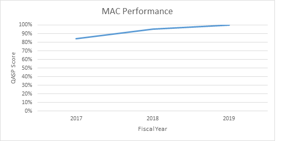 An overall positive trend can be observed from Fiscal Year 2017 – 2019. Specifically, there has been an overall increase of 16 percentage points (19% increase) as well as an increase, every year, in the lowest score. Every year at least one MAC was in 100% compliance.