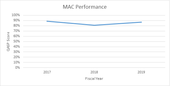 A slightly negative trend can be observed from Fiscal Year 2017 – 2019. Overall there has been a two percentage point decrease (2% decrease). However, there has been a 6-percentage point increase from 2018 to 2019. Every year at least one MAC was in 100% compliance.