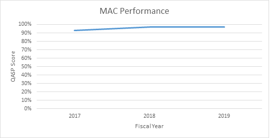 An overall positive trend can be observed from Fiscal Year 2017 – 2019. Specifically, there has been an overall increase of four percentage points (4% increase) since 2017 as well as an increase in the lowest score. Every year at least one MAC was in 100% compliance.