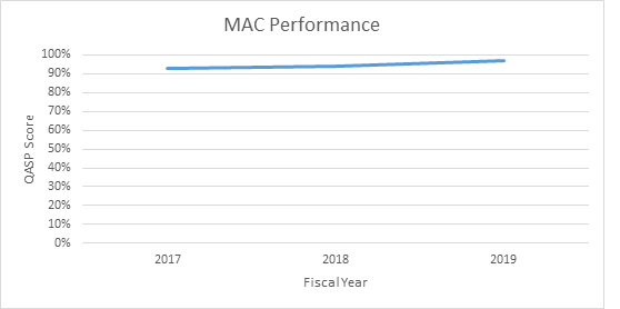 An overall positive trend can be observed from Fiscal Year 2017 – 2019. Specifically, there has been an overall increase of four percentage points (4% increase) since 2017 as well as an increase in the lowest score. Every year at least one MAC was in 100% compliance.