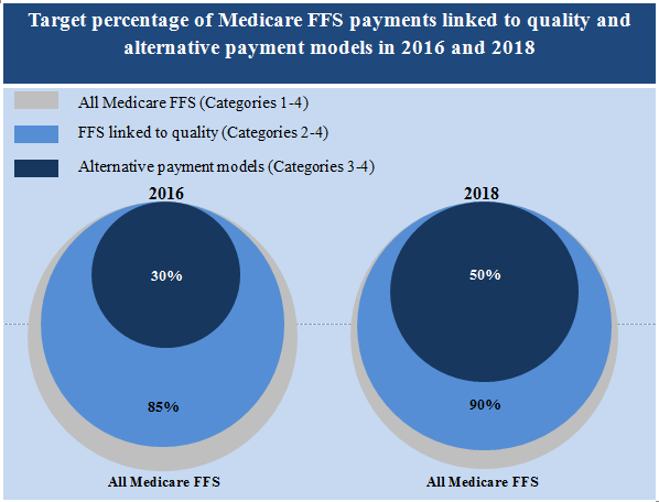 To help drive the health care system towards greater value-based purchasing – rather than continuing to reward volume regardless of quality of care delivered – HHS has set a goal to have 30 percent of Medicare payments in alternative payment models (categories 3 and 4) by the end of 2016 and 50 percent in categories 3 and 4 by the end of 2018. This will be achieved through investment in alternative payment models such as Accountable Care Organizations (ACOs), advanced primary care medical home models, new models of bundling payments for episodes of care, and integrated care demonstrations for beneficiaries that are Medicare-Medicaid enrollees. Overall, HHS seeks to have 85 percent of Medicare fee-for-service payments in value-based purchasing categories 2 through 4 by 2016 and 90 percent by 2018.