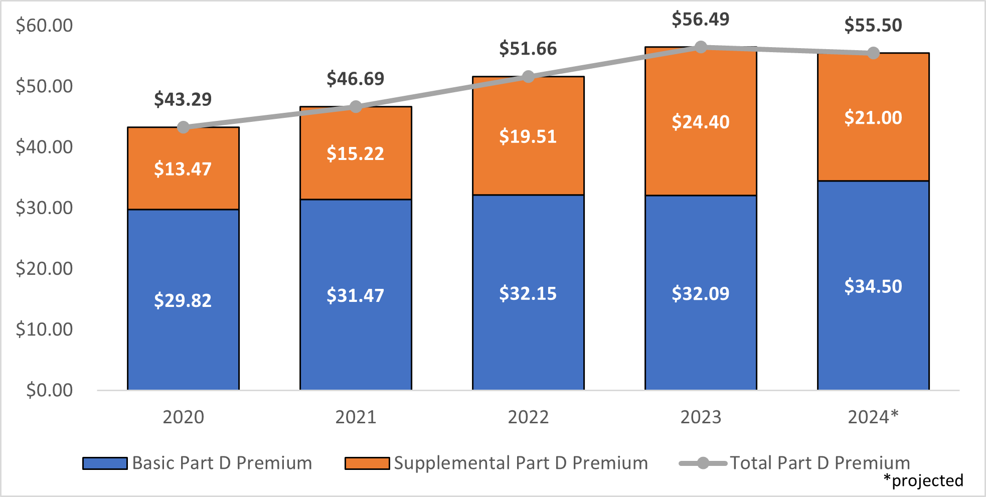 - The program-wide average supplemental Part D premium is projected to decrease from $24.40 in 2023 to $21.00 in 2024.