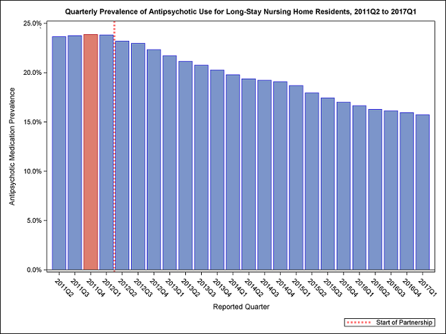 Today, the National Partnership to Improve Dementia Care announced that it met its goal of reducing the national prevalence of antipsychotic use in long-stay nursing home residents by 30 percent by the end of 2016. It also announced a new goal of a 15 percent reduction by the end of 2019 for long-stay residents in those homes with currently limited reduction rates, using the prior baseline rate (fourth quarter of 2011). The data below show current trends related to the prevalence of antipsychotic use.
