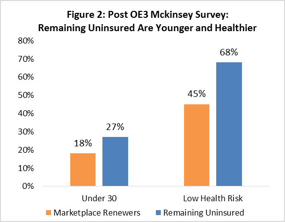 Since the ACA was enacted, the overall uninsured rate has fallen by more than 40 percent, and the uninsured rate among young adults has fallen by more than half (see Figure 1). But younger and healthier adults are still more likely than average to remain uninsured (see Figure 2). Insuring these groups lets them invest in their health, protects them against catastrophic costs from serious illness, and helps young adults continue their education. It also contributes to a more balanced Marketplace risk pool and lower costs.