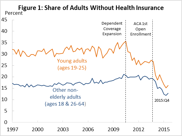 The Affordable Care Act has contributed to historic progress in covering both children and young adults. In 2015, the uninsured rate for children fell below 5 percent for the first time on record. The uninsured rate for young adults (ages 19-25) fell to 15.8 percent, which is less than half the uninsured rate in 2010. These gains in large part reflect increases in the share of eligible children signing up for Medicaid and the Childrenâs Health Insurance Program (CHIP), as well the ACAâs provision giving young adults the option to stay on their parentsâ health insurance until they turn age 26.
