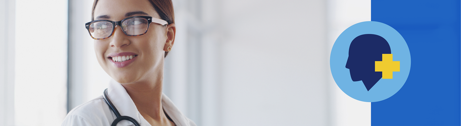 A female doctor wearing glasses smiles and looks to her right, next to a graphic of head with a plus symbol next to it