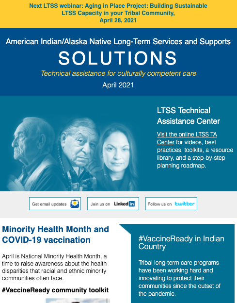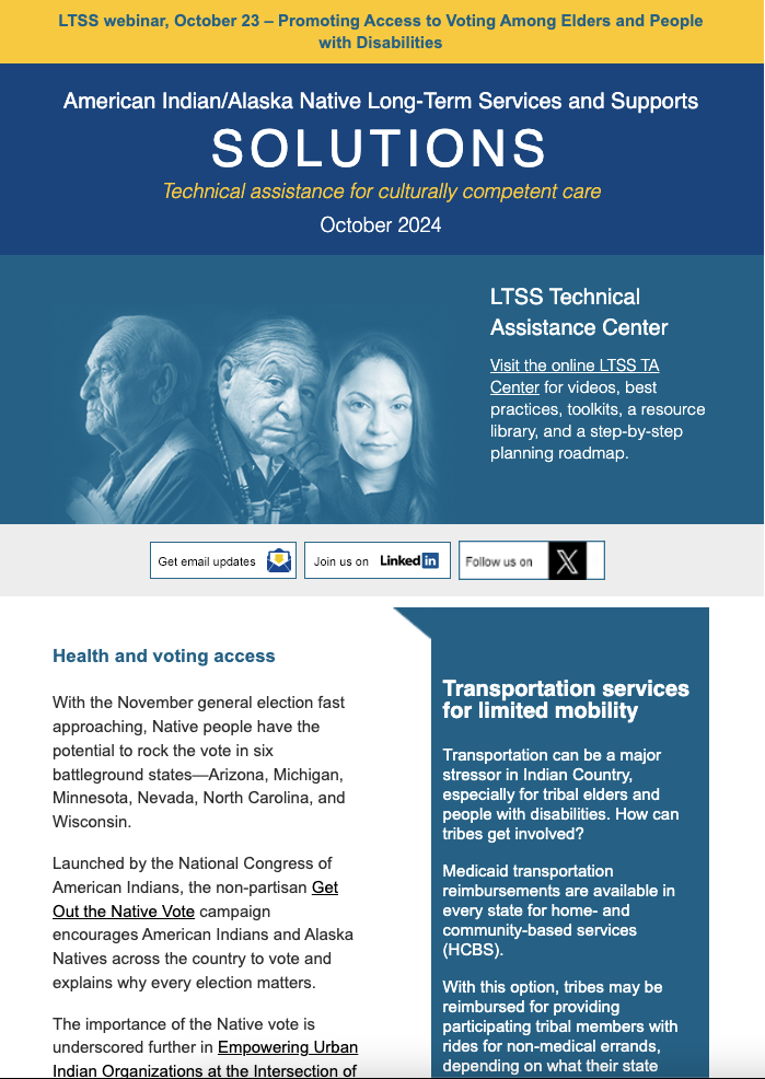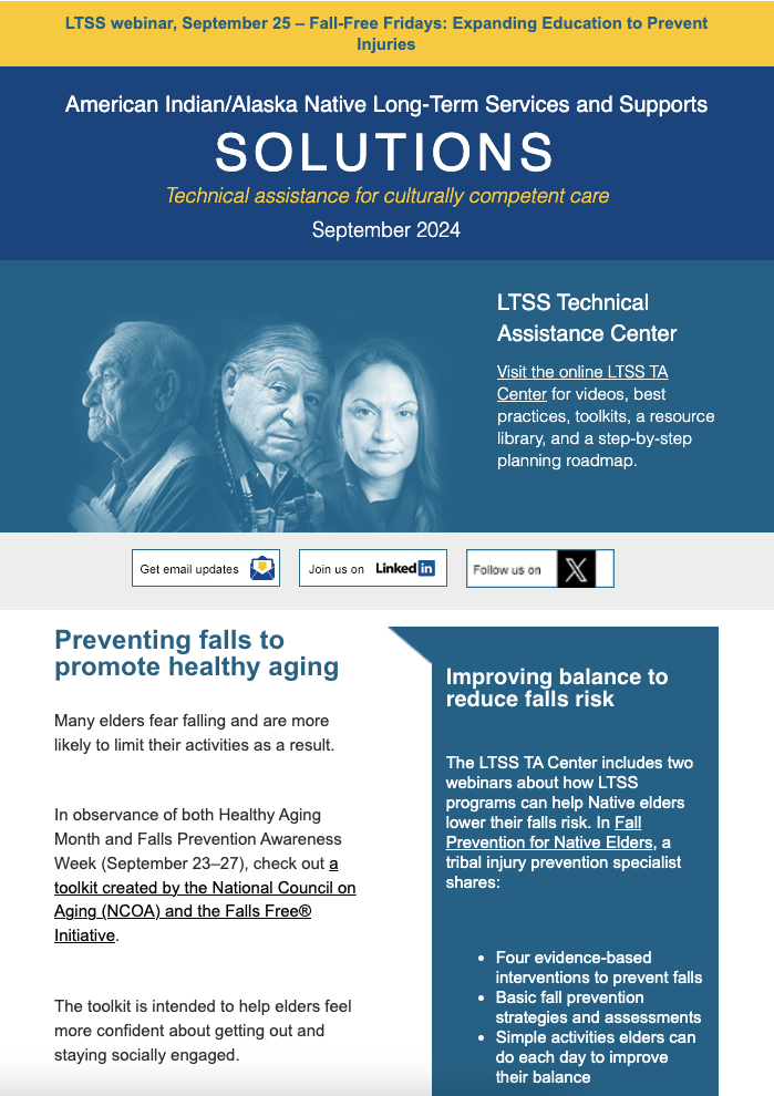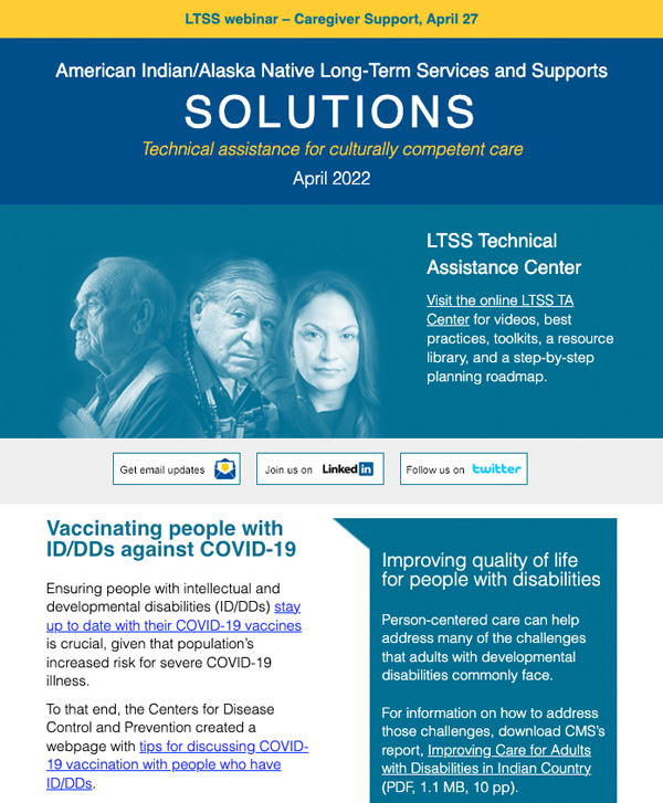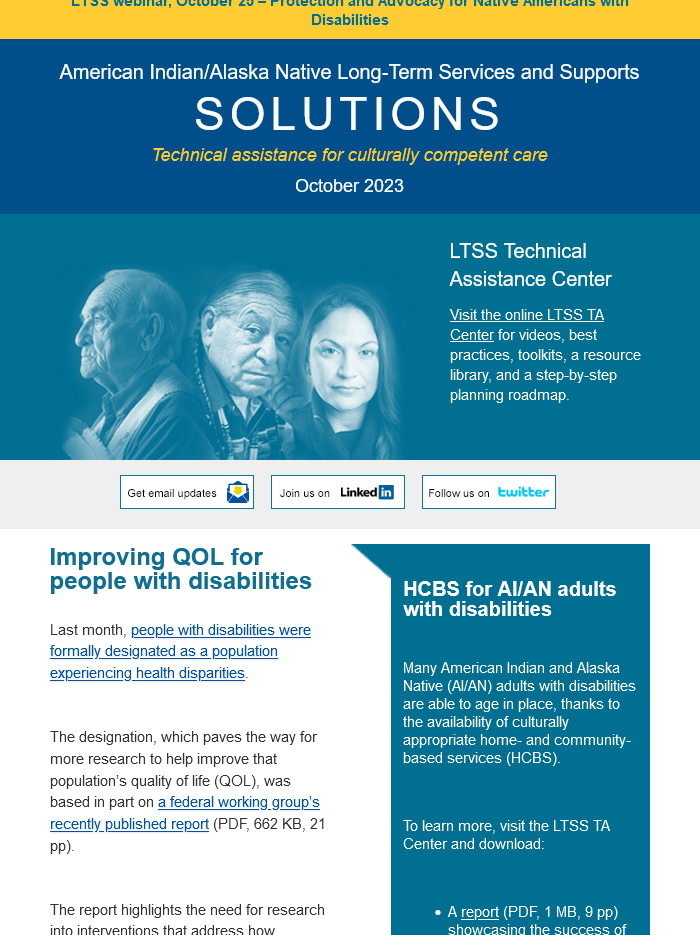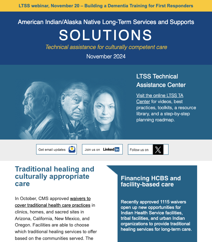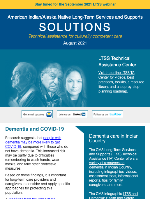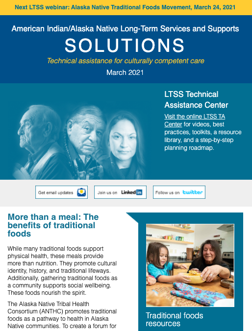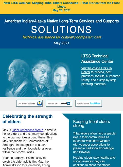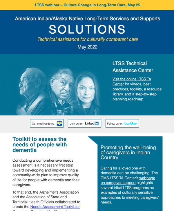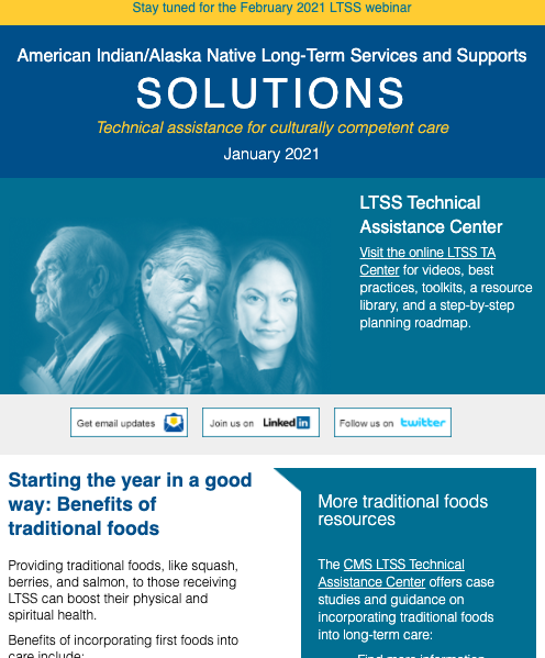 The LTSS newsletter shares news, funding and webinar announcements, and online resources at the LTSS TA Center. Designed for health planners, health department or program employees, care providers, tribal leaders, community advocates, and anyone else interested in LTSS, the newsletter is published monthly and emailed to those who have signed up to receive it.