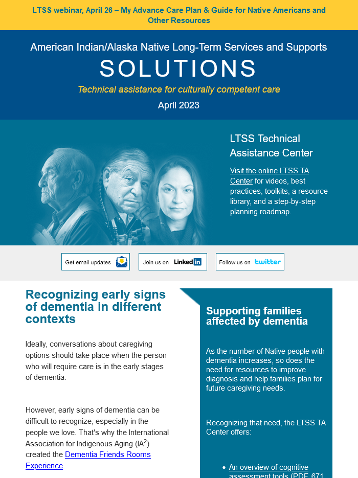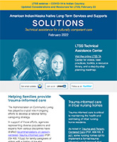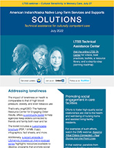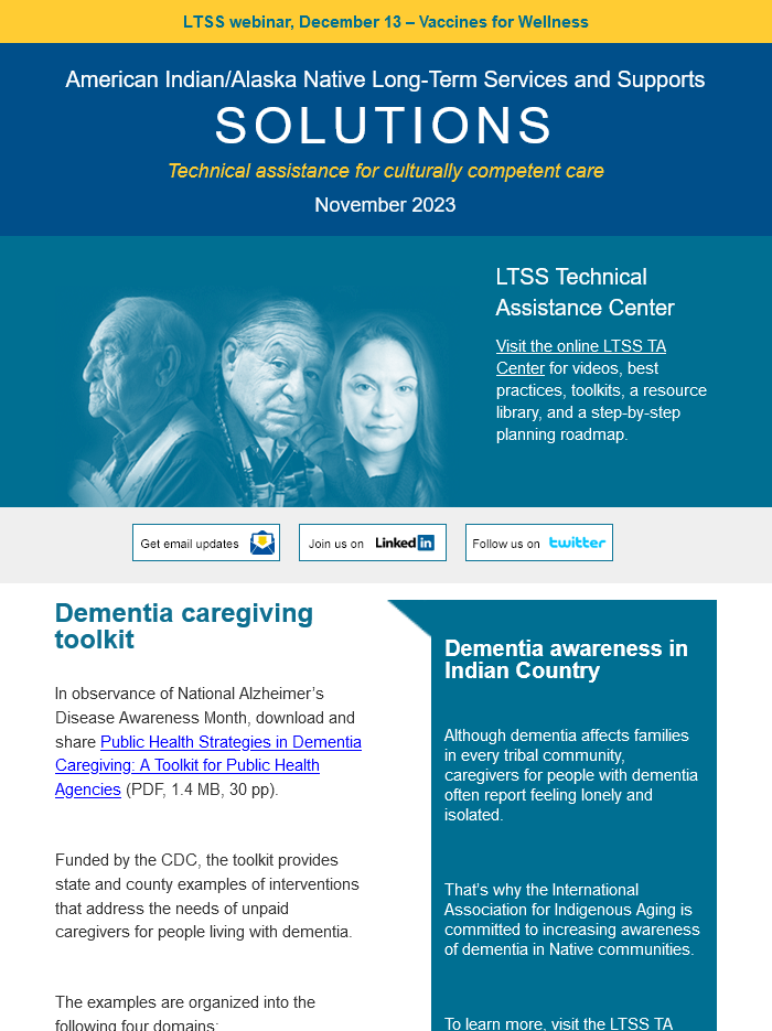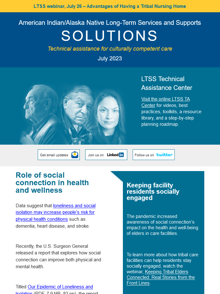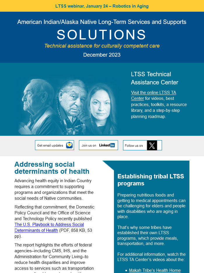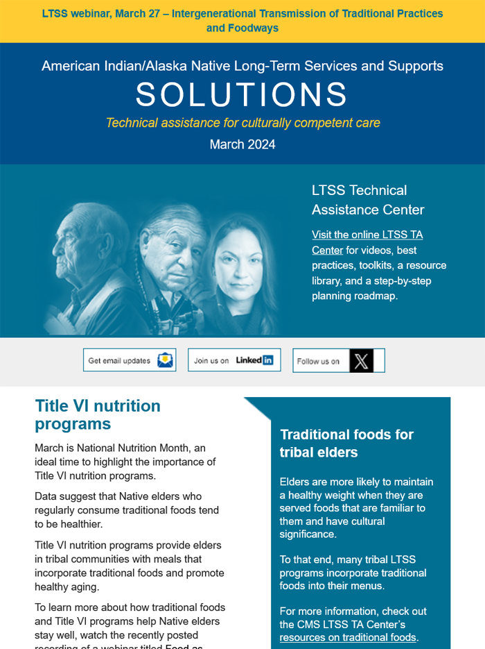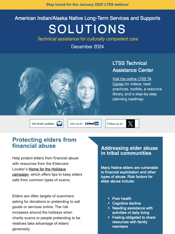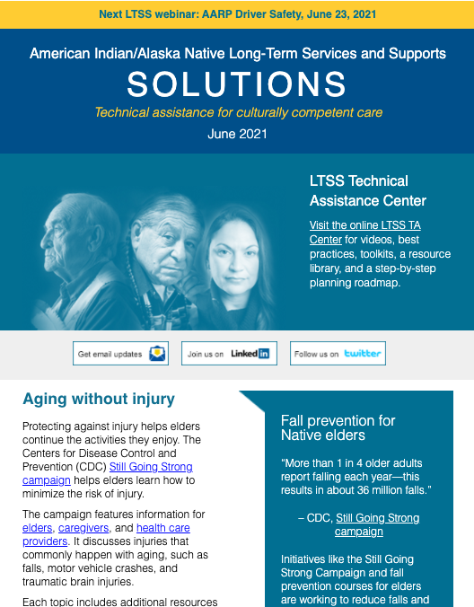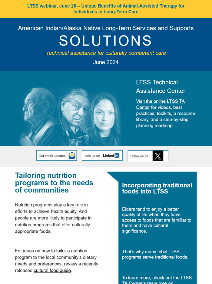 The LTSS newsletter shares news, funding and webinar announcements, and online resources at the LTSS TA Center. Designed for health planners, health department or program employees, care providers, tribal leaders, community advocates, and anyone else interested in LTSS, the newsletter is published monthly and emailed to those who have signed up to receive it.