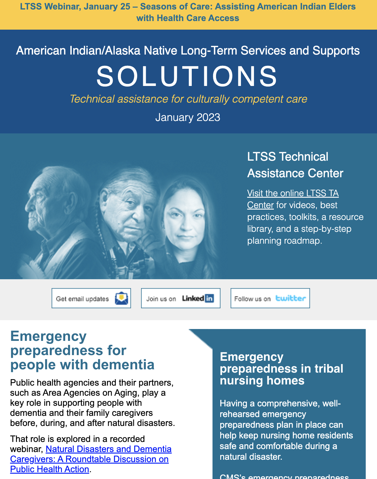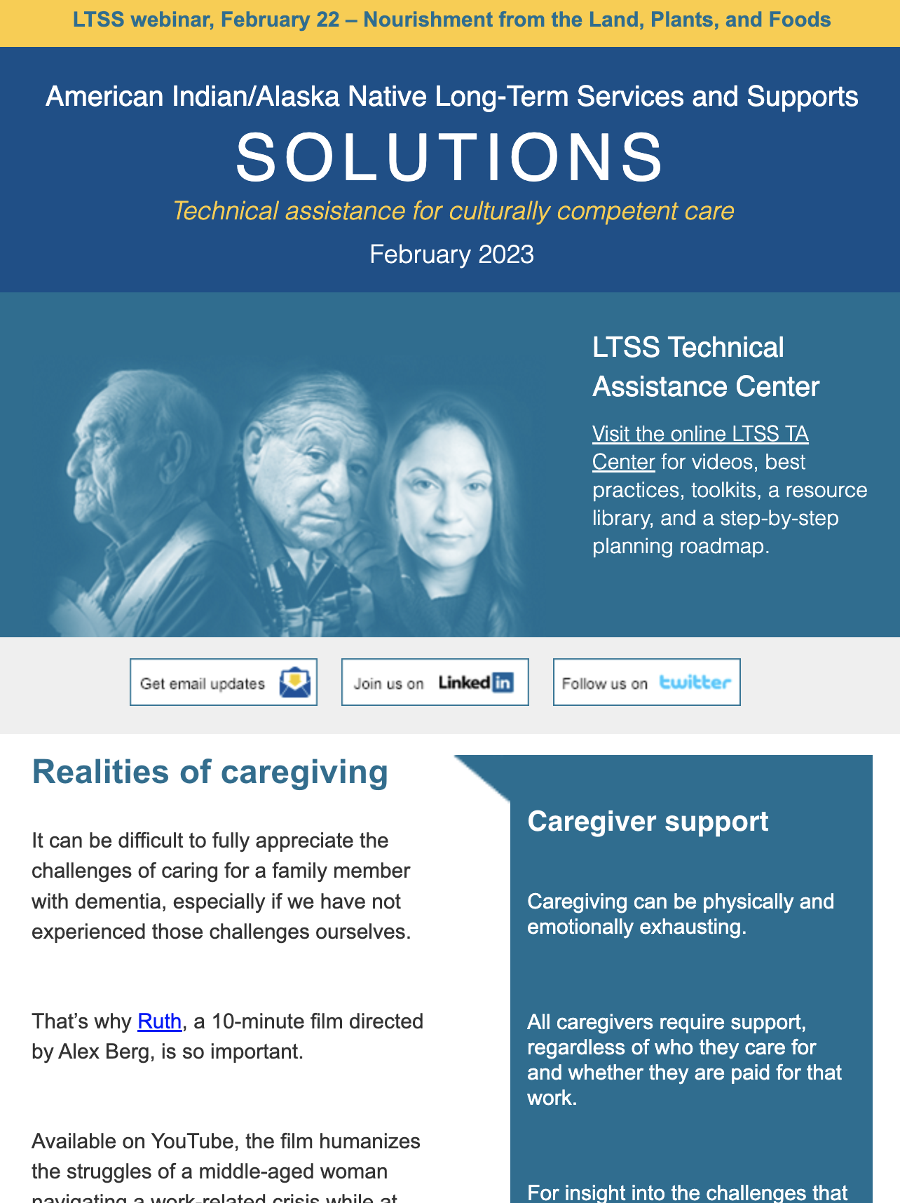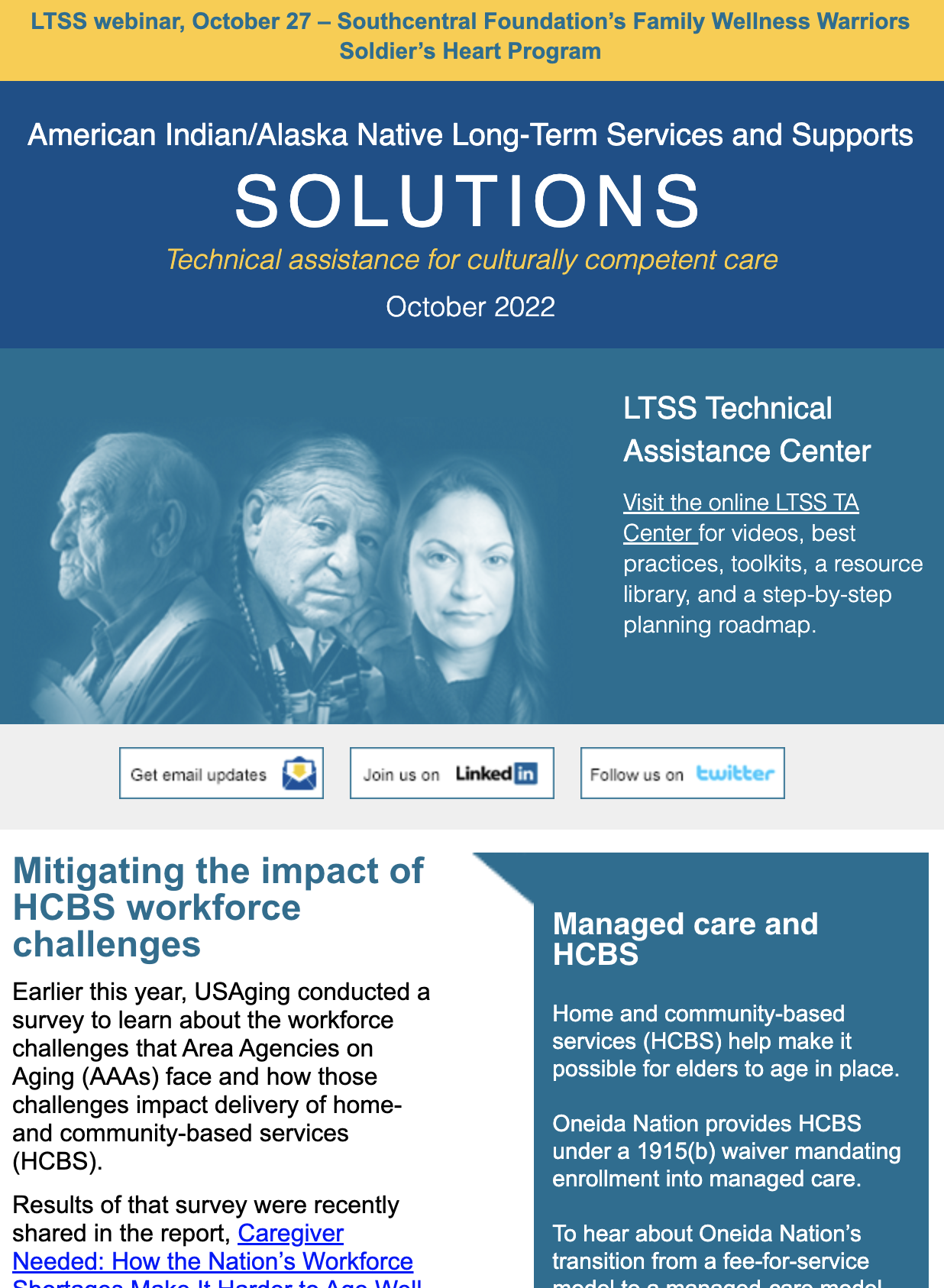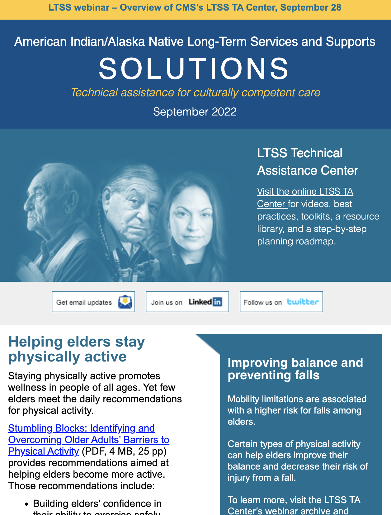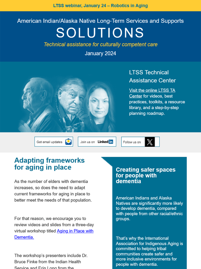 The LTSS newsletter shares news, funding and webinar announcements, and online resources at the LTSS TA Center. Designed for health planners, health department or program employees, care providers, tribal leaders, community advocates, and anyone else interested in LTSS, the newsletter is published monthly and emailed to those who have signed up to receive it.