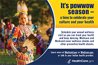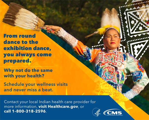 Celebrate your culture and your health. Schedule your free wellness visit and keep dancing. Learn more at Medicaid.gov, Medicare.gov, or talk to your Indian health provider.