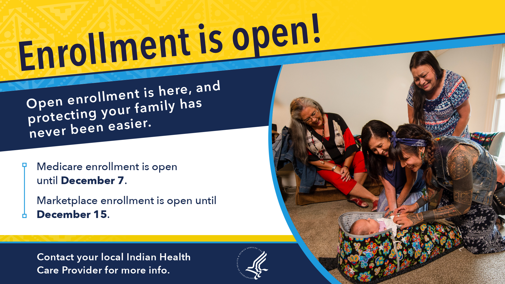 Marketplace Enrollment is open: November 1, 2023 – January 15, 2024For more information, contact your Indian health care provider, visit HealthCare.gov, or call 1-800-318-2596