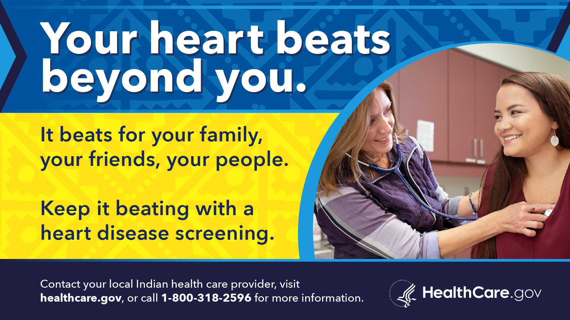 Your heart beats beyond you. It beats for your family, your friends, your people. Keep it beating with a heart disease screening. Contact your local Indian health care provider, visit healthcare.gov or call 1-800-318-2596. A message from the Centers for Medicare and Medicaid Services.