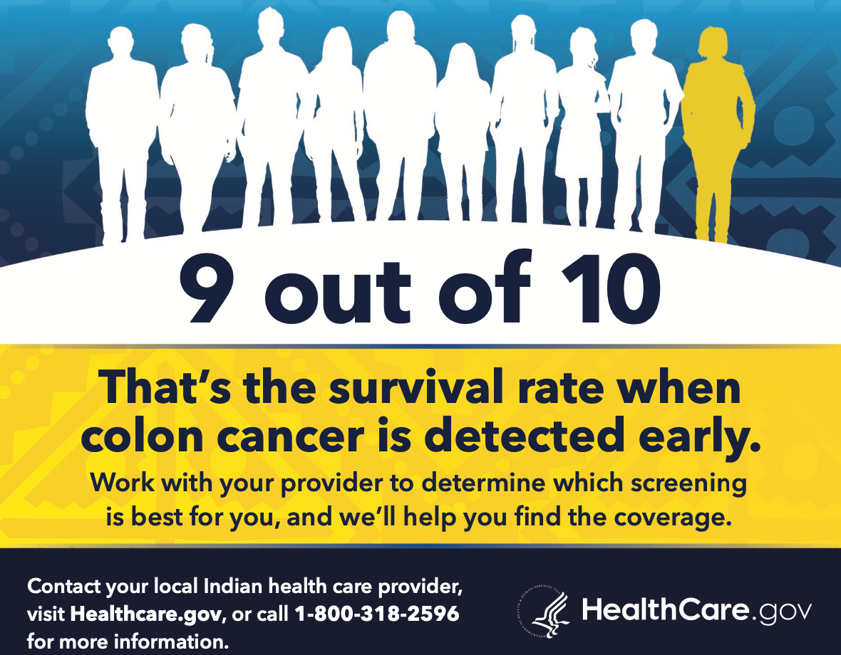 90%. That's the survival rate when colon cancer is detected early. Health Care coverage includes cancer screenings. Enroll now. Contact your local Indian health care provider, visit healthcare.gov or call 1-800-318-2596. A message from the Centers for Medicare and Medicaid Services.