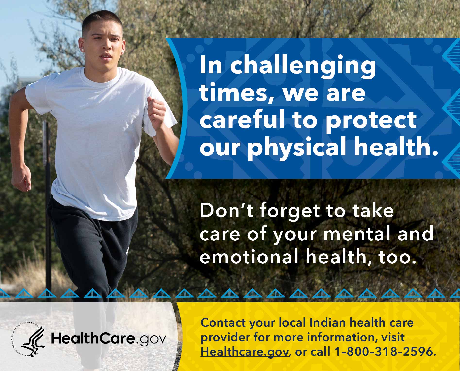 In challenging times, we are careful to protect our physical health. Don't forget to take care of your mental and emotional health. Contact your local Indian health care provider, visit healthcare.gov or call 1-800-318-2596. A message from the Centers for Medicare and Medicaid Services.