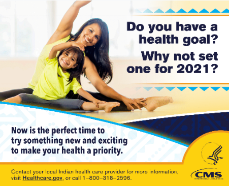 Do you have a health goal for 2021? Now is the perfect time to try something new and exciting to make your health a priority. Contact your local Indian health care provider for more information, visit Healthcare.gov, or call 1–800–318–2596. A message from the Centers for Medicare and Medicaid Services.