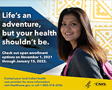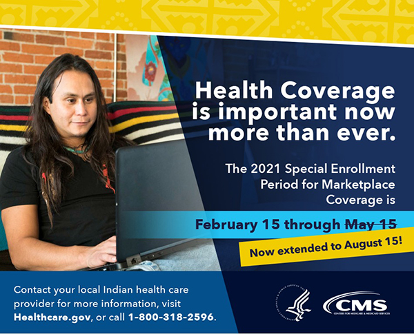 Health Coverage is important now more than ever. Enroll in Marketplace Coverage now through May 15, 2021. Contact your local Indian health care provider for more information, visit Healthcare.gov, or call 1–800–318–2596. A message from the Centers for Medicare and Medicaid Services.