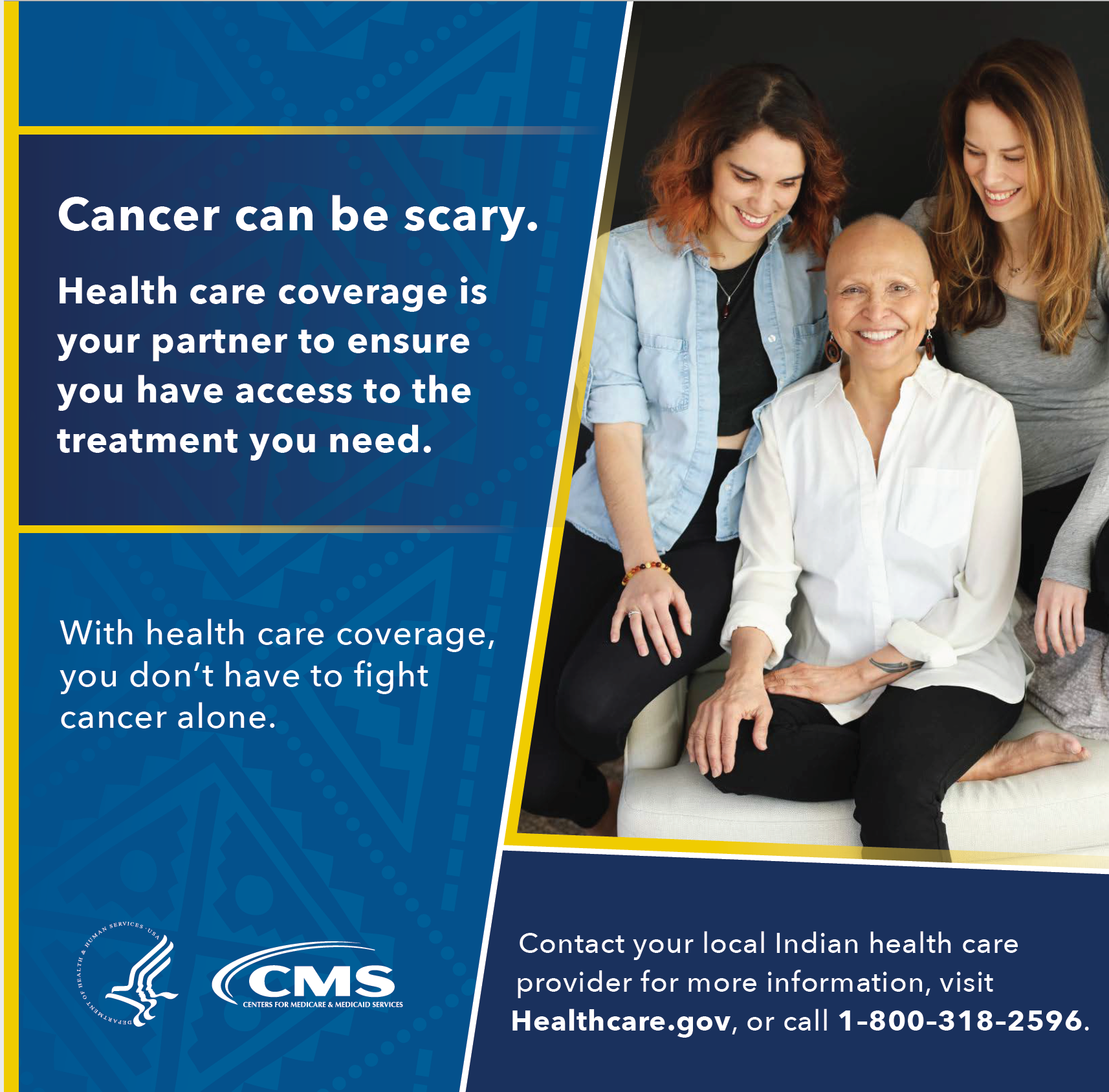 Cancer can be scary. Health care coverage is your partner to ensure you have access to the treatment you need. You are not alone. Contact your local Indian health care provider for more information, visit Healthcare.gov, or call 1–800–318–2596. A message from the Centers for Medicare and Medicaid Services.