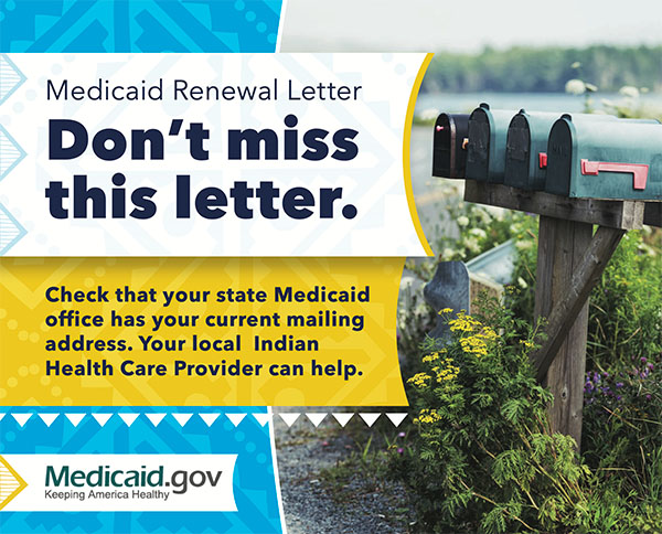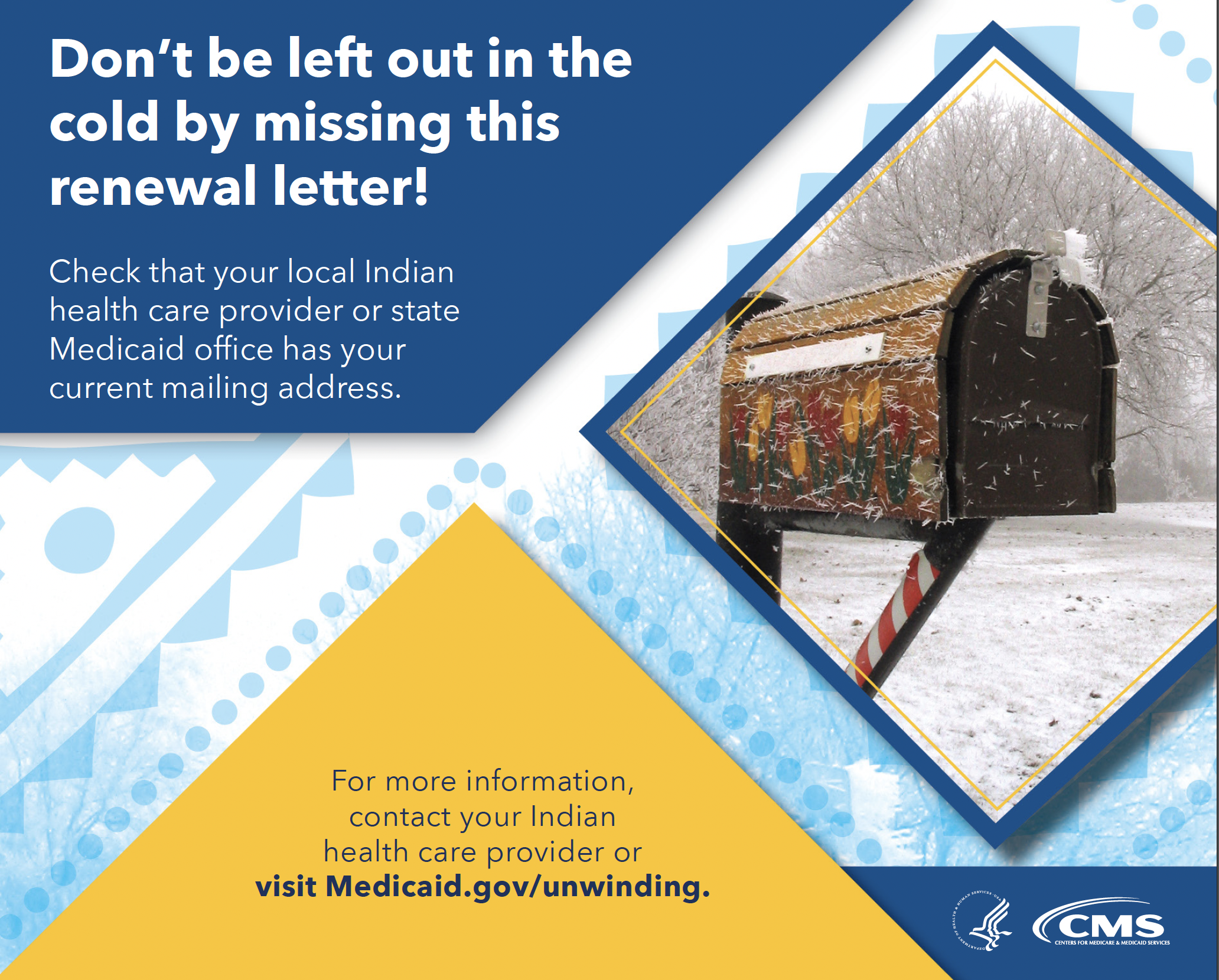 Make sure you get this renewal letter so you're not left out in the cold! Check that your local Indian health care provider or state Medicaid office has your current mailing address. A message from the Centers for Medicare & Medicaid Services.