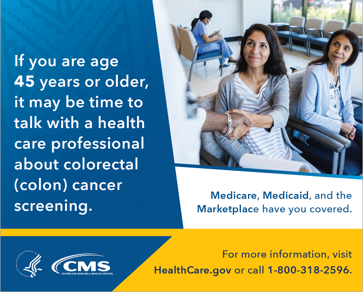 If you are age 45 years or older, it may be time to talk with a health care professional about colorectal (colon) cancer screening. Medicare, Medicaid, and the Marketplace have you covered.