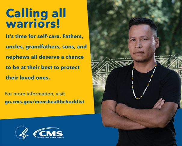 Men, regular check-ups and preventive health care will keep you strong and healthy for yourself, your family, and your community. Learn more at Medicaid.gov, Medicare.gov, or talk to your Indian health provider.