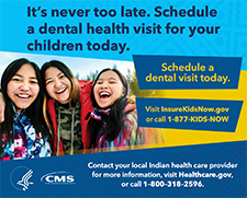 It is never too late. Schedule a dental health visit for your children today. Visit InsureKidsNow.gov or call 1-877-KIDS-NOW. Contact your local Indian health care provider for more information, visit Healthcare.gov, or call 1–800–318–2596. A message from the Centers for Medicare and Medicaid