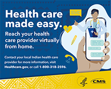 Health care made easy- reach your healthcare provider virtually from home. Contact your local Indian health care provider for more information, visit Healthcare.gov, or call 1–800–318–2596. A message from the Centers for Medicare and Medicaid Services.